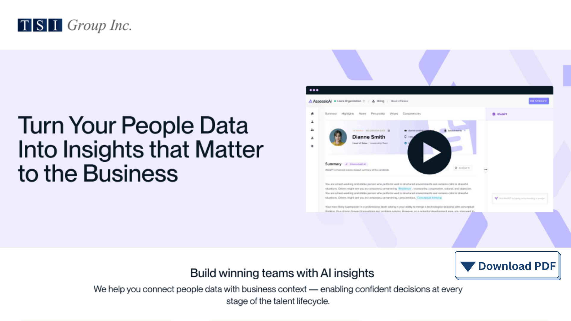 TSI is the first Canadian firm to adopt AssessioAI, an innovative AI platform which helps us evaluate finalist candidates and understand our client's culture and values. AssessioAI ensures our candidate assessment process is supported by data-driven decision-making.